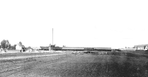 oben: Die Ziegelei Sedlmair, Bauplatz des späteren Zwangsarbeiterlagers an der Lohengrinstraße in östlicher Richtung gesehen, in der Mitte des Bildes, rechts daneben die Lagerbaracken, rechts hinten die Lohengrinkaserne (heute Prinz-Eugen-Kaserne) an der Cosimastraße.