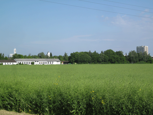 Noch scheint sich aber trotz aller neuen baulichen Aktivitäten das Bild des "alten" Daglfings erhalten zu haben – zumindest kann der Blick im Jahr 2013 an der Daglfinger Straße (hier etwa Höhe Hausnummer 93, ander Ecke zur Kattowitzer Straße) noch immer über weite Felder schweifen. Im Hintergrund die Gebäude der ehemaligen Seilerei Josef Schwaiger's Witwe, dahinter die Kirchtürme von Immanuel (links) und St. Emmeram (rechts). Die Hochhäuser von Englschalking ganz außen rechts am Bildrand scheinen in weite unwirkliche Ferne gerückt.