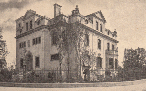 Als dritter Bau in der Folge wurde von der Firma Heilmann & Littmann an der äusseren Prinzregentenstraße die Villa des Herrn Professor Stuck nach den Entwürfen dieses Künstlers ausgeführt. Weniger bekannt ist die in den Jahren 1899/1901 für Herrn Ingenieur Diesel erbaute Villa an der Ecke der Maria-Theresia- und Höchlstraße. In bevorzugter Lage, von grosser Gartenanlage umgeben, macht schon das Äussere in seinen ruhigen Barockformen einen gediegenen, vornehm abgeschlossenen Eindruck. Die Architekturteile der Fasaden sind hier uas gelbem Königsbacher Sandstein, die Wandflächen in grauem Terranova-Putz, Gebäudesockel, Pfeiler und Gitterschwellen der reichen Einfriedung aus werkseinmässig bearbeitetem Beton.