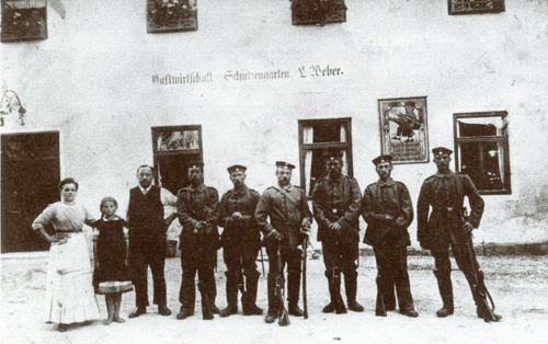 Gasthof »Weberwirt« / Gasthof »Schützengarten«, Oberföhringer Straße 183, mit Schützen, um 1910 © privat