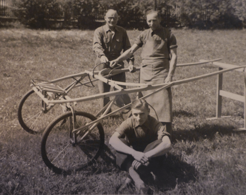 Trabersullky aus der Werkstatt Grichtmaier mit Lehrling und Angestellten der Firma, o.J.