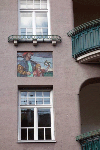 Abbildung unten: Mosaik am Mietshaus Holbeinstraße 5 hpt©Verein für Stadtteilkultur im Münchner Nordosten