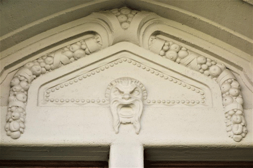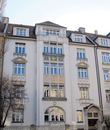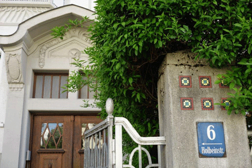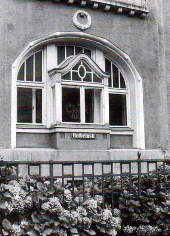 Liebevolle Fenstergestaltung in der Mittelachse im Erdgeschoss Holbeinstraße 6. Scan aus: Willibald Karl/Gisela Scola: Bogenhausen. Vom bäuerlichen Pfarrdorf zum noblen Stadtteil, München 1992, S. 118.