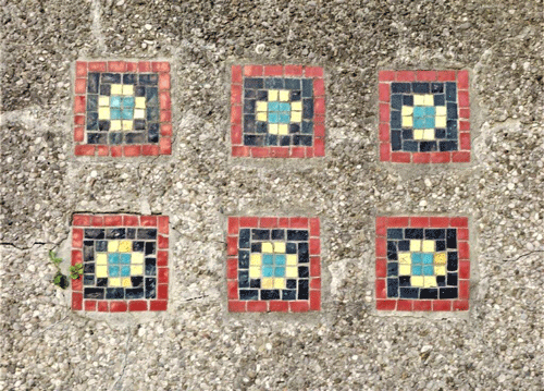 Eingangsbereich, Portalsegment und Mosaikschmuck im Gartenzaumpfeiler. hpt©verein für Stadtteilkultur im Münchner Nordosten e.V., Mai 2021
