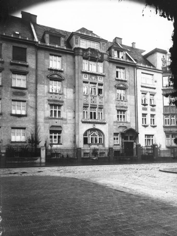Mietshaus Holbeinstraße 6 von der Friedrich-Herschel-Straße aus gesehen, Fotografie von Georg Pettendorfer 7.1.1909 © Stadtarchiv München, Sign. DE-1992-FS-NL-PETT1-1244. Links Holbeinstraße 8, rechts Holbeinstraße 4.