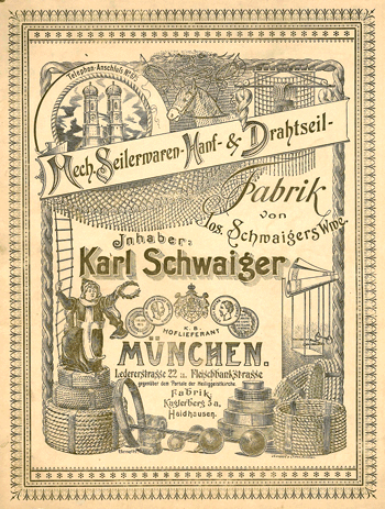 1629 kauft Hieronymus Mayr ein Anwesen in der Ledererstraße 22 (heute Hausnummer 9) in München und macht es zum ersten Sitz der Seilerei. (Hier war bis vor kurzem das Ladengeschäft mit Segelsportabteilung untergebracht.) Damit ist die Firma »Jos. Schwaiger's Witwe« mit 383 Jahren – nach den großen Münchner Brauereien –, der älteste Münchner Industriebetrieb. Im Stammhaus in der Ledererstraße, damals Haus Nr. 209 im Graggenauer Viertel, zwischen Marienplatz und Hofbräuhaus, entstehen die Seile und Stricke im Familienbetrieb. Frau und Kinder müssen das Spinnrad drehen, während der Seiler rückwärtsgehend den Faden spinnt. Die auf diese Weise entstehenden Stricke und Taue aus Hanf oder Rosshaar dienen den Bauern im Münchner Umland, helfen auf den Gerüsten der neuen Gebäude der Residenzstadt.