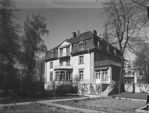 unten: Rückseite mit Garten Maria-Theresia-Straße 30, 14.4.1959 © Stadtarchiv München, DE-1992-FS-STR-1190. Rechts im Bild ist die Rückseite der benachbarte Diesel-Villa, Höchlstraße 2, zu sehen