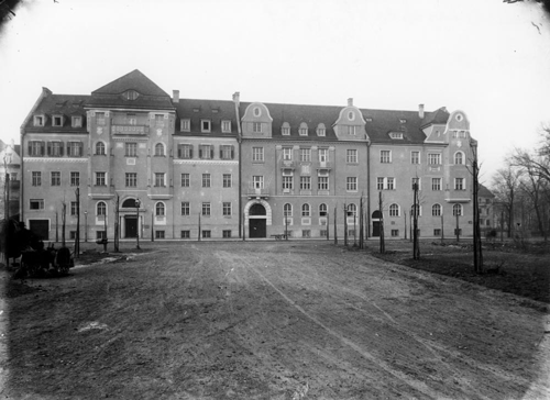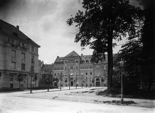 oben: Die frisch errichteten Mietswohnhäuser an der Mauerkircherstraße 3, 5 und 7 (von links nach rechts). Fotografie Georg Pettendorfer am 10.1.1910. Quelle: Stadtarchiv München, Sign. DE-1992-FS-NL-PETT1-2440