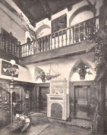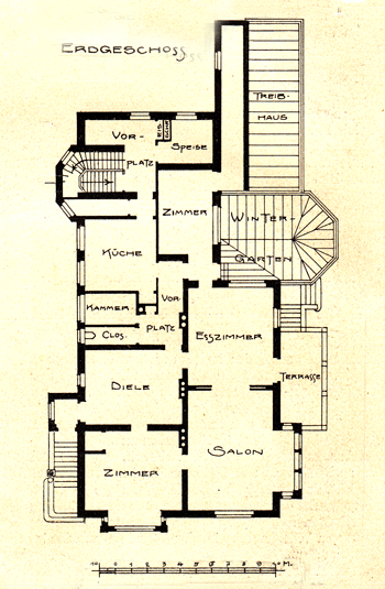 »Im hochgelegenen Erdgeschoss, um eine Diele geschickt zusammengedrängt liegen die Empfangs- und Gesellschaftsräume, sowie an einem Wirtschaftskorridor die Küche mit Nebenräumen und die Dienstbotentreppe. Zimmer und Salon an der Straße haben Erker, das Esszimmer mit vorgelegter Gartenterrasse gewährt durch ein großes Fenster Einblick in den Nastpßenden Wintergarten mit Treibhaus. Im Obergeschoss sind die die Wohn- und Schlafzimmer untergebracht. Die Fassaden sind in einfachen Putzformen durchgebildet, nur die Erkervorbauten zeigen eine reichere Architektur. Die nach allen Seiten abgewalmten Dachflächen sind mit roten Biberschwänzen gedeckt. Die Ausstattung der Innenräume ist eine vornehm bürgerliche und wirkt namentlich die durch zwei Geschosse führende Diele mit ihrem dunklen Holzwerk, hellen, von Nischen unterbrochenen Wandflächen, eingebauten Treppe, unterwölbten Galerie, Bilder- und Wappenschmuck, Jagd-Trophäen usw., an gute Tiroler-Motive erinnernd, recht intim und anheimelnd.«