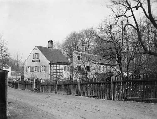 Vorstadthäuschen mit Gärten und Gänsefedernverkauf: die Anwesen Montgelasstraße 25 und 27, um 1905. Fotografie Georg Pettendorfer. Quelle: Stadtarchiv München, Sign, DE-1992-FS-NL-PETT1-2497, URL: http://stadtarchiv.muenchen.de/scopeQuery/detail.aspx?ID=424338