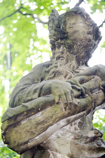 unten: Figur des Winters auf Sockel, wohl aus einem Zyklus der vier Jahreszeiten Sandstein, um 1750, auf dem Gelände der abgegangenen Wallfahrtskirche des Mittelalters und der frühen Neuzeit mit zugehörigem Friedhof »St. Emmeram in Chunntal«.