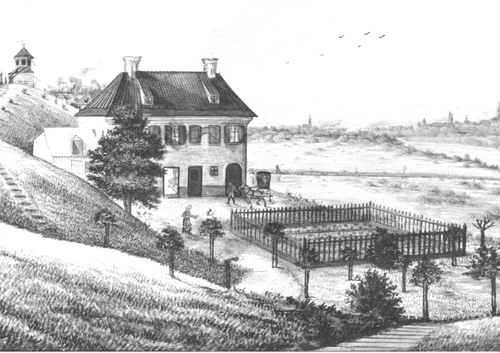 oben: Die Höchl-Villa, ehemals Oberföhring, Haus Nr. 1 (heute Spervogelstraße 12), um 1835, damals im Besitz der Metzgerseheleute Klement und Barbara Schäffler, die darin eine Gaststätte »St. Emmeram« unterhielten. Quelle: Karin Bernst, Oberföhring. Das Dorf und seine Bewohner im 19. Jahrhundert, München 2000.