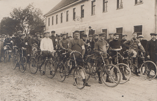 Radrennen vor der »Realen Gast- und Tafernwirtschaft Hans Sagmeister, Metzger und Wirt, Fremdenbetten« (Inschrift auf dem Gebäude), Eggenfeldener Straße 63, ca. 1914.