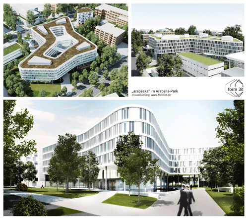 Ab 2013 wurde das im Besitz der Versicherungsgesellschaft der Bayerischen Versorgungskammer befindliche, ehemalige 14-stöckige Bürohochhaus, das sich mit seiner Blockbebauung nördlich entlang der Arabellastraße und südlich bis zur Denninger Straße auf einer Grundstücksfläche von 4600 Quadratmetern erstreckt, in einen völlig neuen Büro- und Wohnkomplex umgewandelt. Das Scheibenhochhaus war so etwas wie das Wahrzeichen im Norden der Stadt, dann wurde es 2009 abgerissen, mangels vorhandener Bausubstanz und aus wirtschaftlichen Überlegungen. An seine Stelle trat ein bemerkenswerter Neubau: Mit seinen dynamischen Formen und fließenden Linen steht das Gebäude mit dem poetischen Namen »Arabeska« (6 Obergeschosse und 3 Untergeschosse) seit der Fertigstellung 2015 in einem extremen Kontrast zur Vergangenheit mit ihrer streng gerasterten Bürohausfassade der 1960er-Jahre. Die Architekten und Ingenieure von h4a Gessert + Decker entkernten das Gebäude komplett und bauten die Fassade vollständig bis auf die Tragstruktur zurück. Neben dem imposanten, lichtdurchfluteten Hauptfoyer, das von einem Glasdach gekrönt wird, ermöglicht ein zweiter Zugang als Haus-in-Haus-Lösung einen repräsentativen Empfang. Frei schwebende, luftige Stege verbinden die ineinanderfließenden Gebäudeteile und sorgen für kurze Wege.