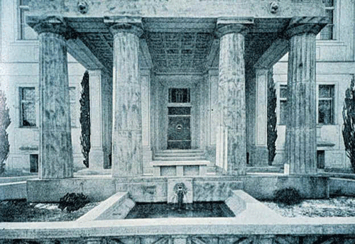 historische Postkarte, um 1900, mit Eingangsbereich und Brunnenanlage