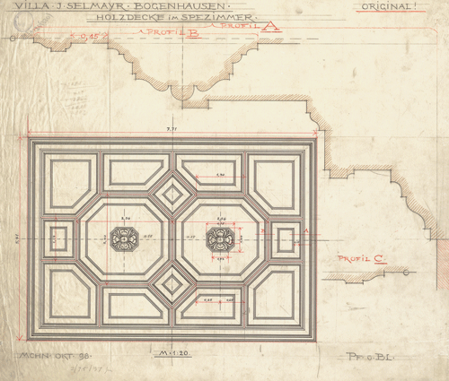 "Villa J. Selmayr Bogenhausen. Holzdecke im Speisezimmer", Entwurfsskizze Pfann, 1898; Quelle: Technische Universität München.