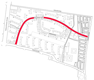 Mitte: Lageplan Parkstadt Bogenhausen. Der rot markierte Straßenverlauf zeigt die Buschingstraße, nördlich davon der Schreberweg.