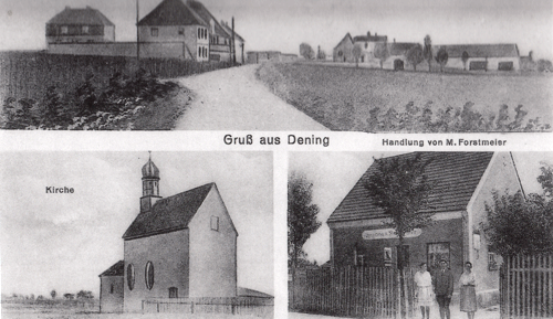 Ansichtskarte aus den 1920er-Jahren; unten links die Schutzkapelle St. Georg und rechts der Spezereiwarenladen von Forstmeiers mit noch ein wenig zaghaft angebrachten Werbeschildern; Scan aus s.o. Oben quer eine Gesamtansicht von Denning mit Blick in Richtung Englschalking. Rechts ist das kleine Häuschen der Forstmeiers zu erkennen, davor das langgezogene Anwesen der Familie Weiss, in dem Rittmeister Jäger seine Pferde einstellte.