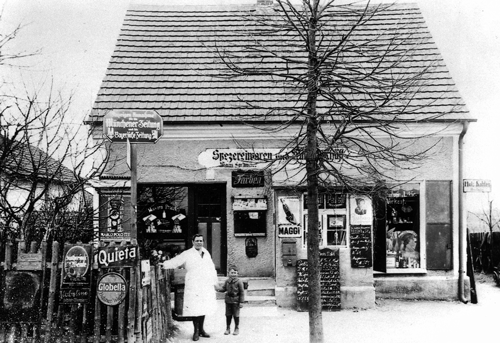 Maria und Sohn Josef Forstmeier, Mitte der 1930er-Jahre vor ihrem Geschäft in der Ostpreußenstraße 40; noch gibt es vorschriftsgemäß einen eigenen Eingang für den "Milliladen". Buchscan aus: siehe oben.