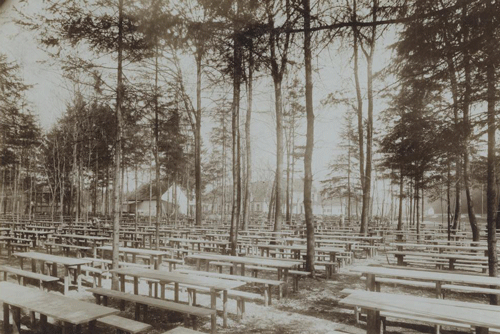 Blick über den leeren Wirtsgarten der »Restauration Herzogpark«, 1910; im Hintergrund Schankhäuschen und Gaststättengebäude. Fotografie Sammlung Valentin. Quelle: Stadtarchiv München, Sign. DE-1992-FS-NL-KV-08040. URL: http://stadtarchiv.muenchen.de/scopeQuery/detail.aspx?ID=409711