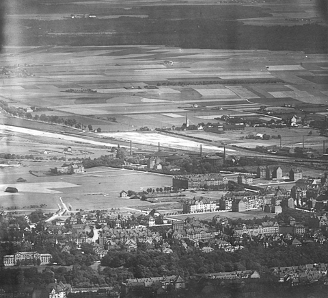 oben: Blick über den Isarhang mit Neuberghausen (links unten) auf das Gaswerk am Kirchstein und auf Baumkirchen. Aufnahme aus dem Jahr 1917. Die massiven Ziegelrundbauten und die Kamine in der Bildmitte gehören zum Gaswerk am Kirchstein. Die zum linken Bildrand führende Allee ist die Truderinger Straße. Aus: "Stadt im Überblick - München im Luftbild 1890–1935", hrsg. von Richard Bauer, Eva Graf, München 1986.