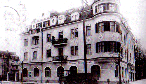 Im Jahr 1909 errichtete Baumeister Lorenz Krieg einen für den Bogenhauser Herzogpark und seine Anwohner wichtigen Treffpunkt, die »Restauration Herzogparkquelle«. Den Plan zum Wohn- und Wirtschaftsneubau an der Ecke Poschinger- / Mauerkircherstraße hatte er ein Jahr zuvor bei der Lokalbaukommission eingereicht.