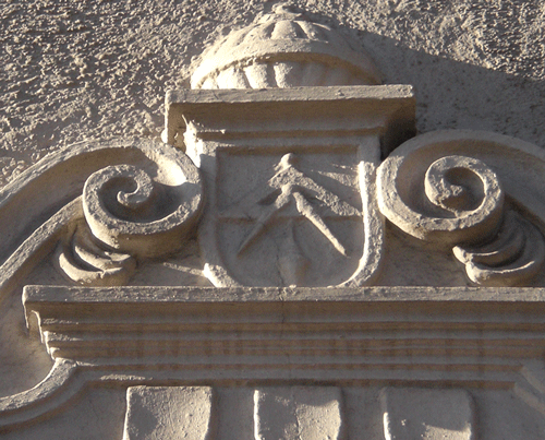 Zirkel und Dreieck über dem Portal sind die zentralen Symbole der Freimaurer.