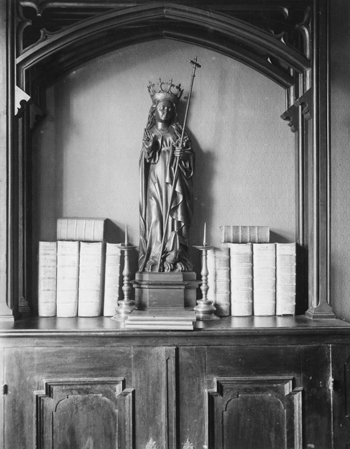 Neugotischer Schrank, mit Madonna und Folianten aus Haus Ismaninger Straße 74. Fotografie Georg Pettendorfer, ca. 1910. Quelle: Stadtarchiv München, DE-1992-FS-NL-PETT1-1392