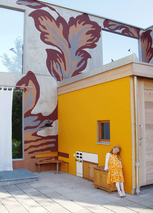 Selten dürfte die Frage, ob auch die täglichen Nutzer eines Gebäudes etwas von der schönen Kunst am Bau haben, so eindeutig und positiv zu beantworten gewesen sein wie hier. Heike Döscher hat 2007 im Außenbereich der Kinderkrippe am Karl-Erb-Weg 9 in Englschalking (Architekt: Grill & Köppel) einen eher toten Winkel zwischen Schallschutzmauer und Geräteschuppen mit einer 6 mal 8 Meter großen Wandmalerei und Holzmöbeln in eine benutzbare und zum Spielen anregende Kinderwelt verwandelt. Ein Vorhang, eine Sitzecke, eine von Kinderhand schaltbare Lampe, ein gemalter Herd mit real drehbaren Knöpfen, eine gemalte Kommode, deren Türen ebenso klappbar sind wie die der tatsächlichen: mit einfachen Mitteln wird der Außenraum zum kindlich dimensionierten Interieur.