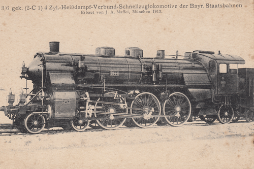 unten: 4-Zylinder-Heißdampf-Verbund-Schnellzuglokomotive der Bayerischen Staatsbahnen auf einer historischen Ansichtskarte um 1913, mit folgenden technischen Angaben auf der Rückseite: