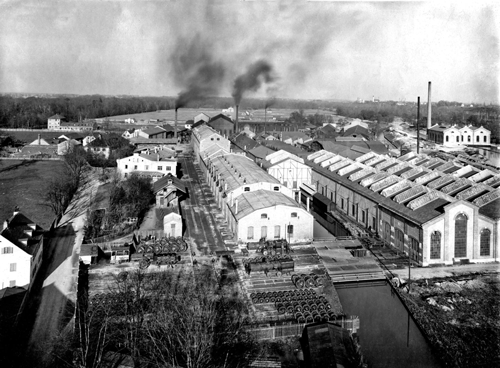 oben: Lokomotivfabrik Maffei in der Hirschau, im Hintergrund Oberföhring mit seinen Ziegeleien, 1902 © Helge Hufschläger