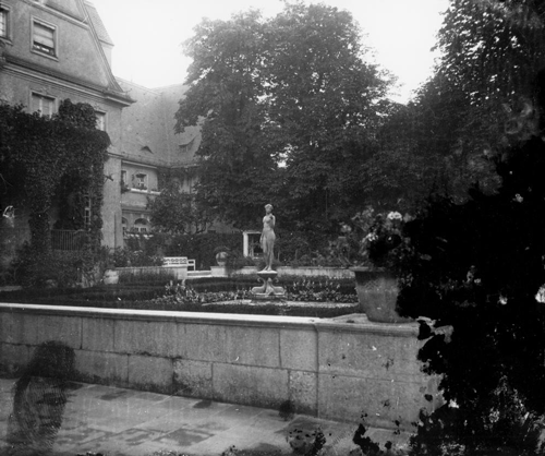 Brunnenfigur im Garten der Lauer-Villa. Fotografie Georg Pettendorfer, 1915, von der ehemaligen Kirchgasse aus gesehen. Quelle: Stadtarchiv München, Sign. DE-1992-FS-NL-PETT1-2508