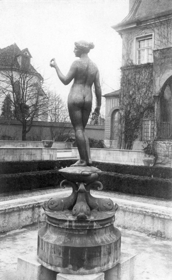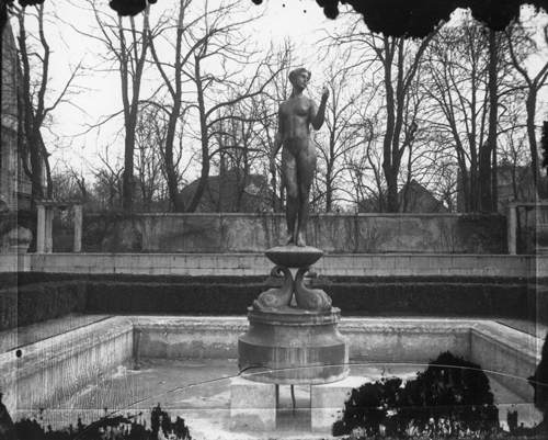 Vorderansicht Brunnenfigur im Garten der Lauer-Villa. Fotografie Georg Pettendorfer, ca. 1920. Quelle: Stadtarchiv München, Sign. DE-1992-FS-NL-PETT1-2510