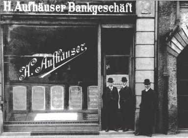 Bankhaus Heinrich Aufhäuser in der Löwengrube 20 mit Gründer Heinrich Aufhäuser sowie seinen Söhnen Martin und Siegfried, 1901. Quelle: Hauck & Aufhäuser/Bayerisches Wirtschaftsarchiv