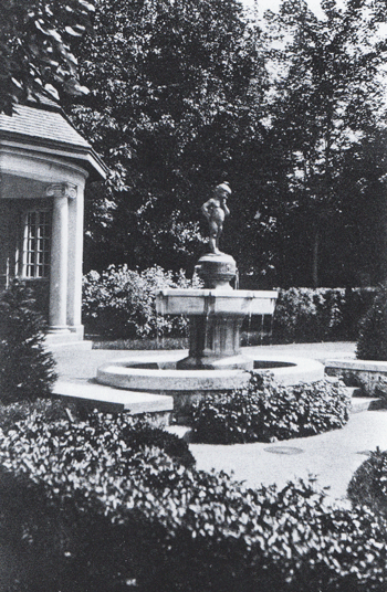 Gartenansicht Villa Ruederer mit Brunnen, um 1910.