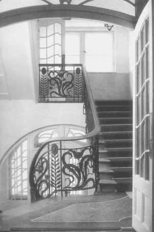 Breit geschwungene »Herrschaftstreppe« mit reich gestaltetem schmiedeeisernem Geländer in der Bechtolsheim-Villa. Alle Schmiedeeisenarbeiten wurden von Kunstschlosser Grohmann gefertigt © privat