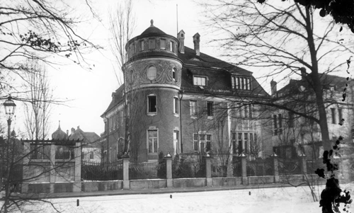 Bechtolsheim-Villa, fotografiert von Georg Pettendorfer, 21. Januar 1908. © Stadtarchiv München Sign. DE-1992-FS-NL-PETT1-2338. Rechts davon die imposante, neoklassizistische Vorderfront der Becker-Villa