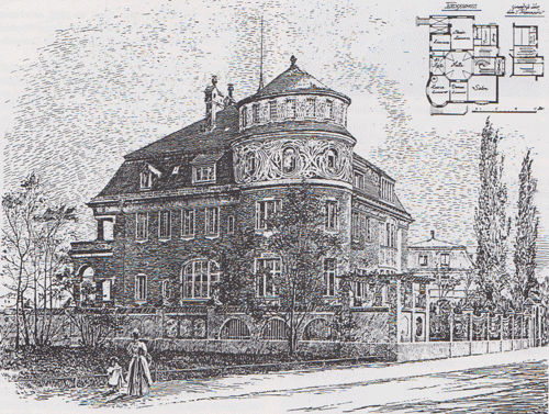 Nordwestansicht der Villa Bechtolsheim; rechts oben Grundriss Hochparterre der Villa. Buchscan aus: Klein, Martin Dülfer, S. 110.