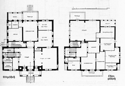 Grundriss Erd- und Obergeschoss der ehemaligen Becker-Villa; Buchscan aus: Bayerischer Architekten- und Ingenieur-Verein (Hg.): München und seine Bauten, München 1912, S. 391.