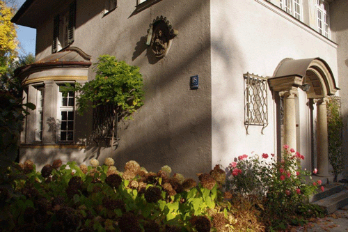 Foto unten: Mauerkircherstraße 48 im Jahr 2012 mit Blick auf den südliche Haupteingang mit Säulenbogen. hpt © Verein für Stadtteilkultur im Münchner Nordosten e.V.