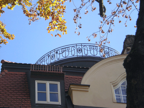 schmiedeeisernes Ziergitter des Dachbalkons der Villa Bischoff © dietlind pedarnig, 2007.