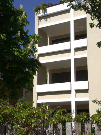 oben: mouse-over-Effekt (bitte mit der Mouse über das Bild fahren): Wohnhaus Möhlstraße 17 in den 1960er Jahren und heute © dietlind pedarnig, 2008