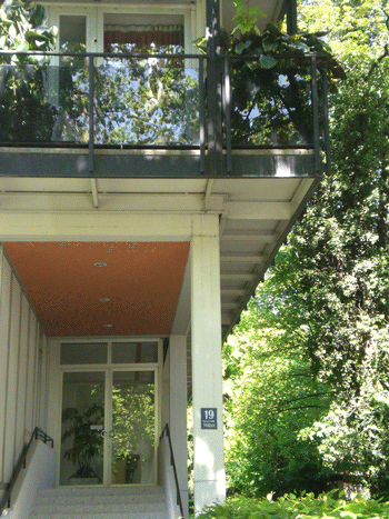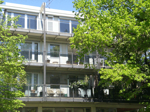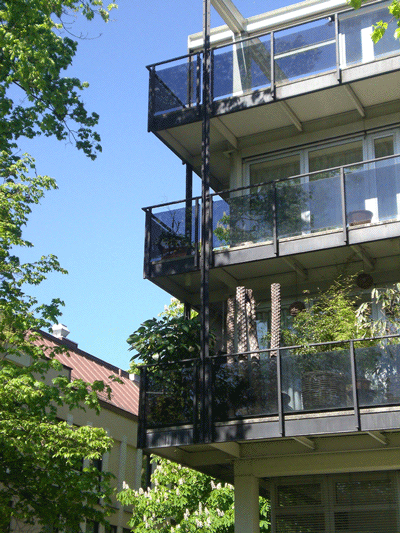 die blau-verglasten Balkone des Steidle-Haus; links sieht man den Neubau Möhlstraße 17 (früher Villa Heusch), © dietlind pedarnig, 2008.