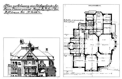 »Plan zur Erbauung eines Wohngebäudes für Herrn Commerzienrat August Pschorr, hier Möhlstraße Nr. 2, Pl. No.258 1/11.« Nordwestansicht 1907 (links) und Grundriss Hochparterre (rechts)