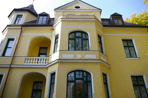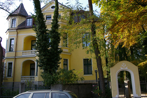 Um 1900 im Stil der »Deutschen Renaissance« errichtete Villa. Seit 1958 hat hier die Vereinigung »Gralskreis in München« - wie am Zeichen im Torbogen zu erkennen - ihren Sitz.