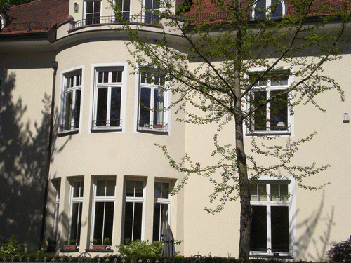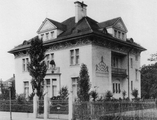 oben: Mouse-over-Effekt (bitte mit der Mouse über das Bild fahren): die Villa Schneider 1905 und nach der Renovierung 1997; Quelle: Buchscan aus: Karl, Möhlstraße, 1998.