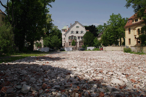 Freier Blick von der Ismaninger Straße aus auf die prächtige Pschorr-Villa durch den Abriss der Reis-Klinik. Rechts ist die ehemalige Herz-Villa (Möhlstraße 30) zu sehen. hpt © Verein für Stadtteilkultur im Münchner Nordosten e.V., Juni 2012