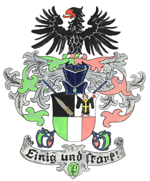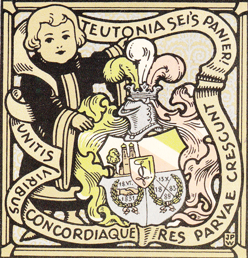 Links Coleurkarte der Münchner Landsmannschaft Teutonia, Buchscan aus: Becker, Ulrich: Alte Studentenpostkarten, München 1990. Wappen und der Wahlspruch galten bis zum Jahr 1924, beides wurden dann modernisiert (Abbildung rechts, © Teutonia München).