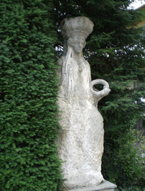 Unvollendete Karyatide von Heinrich Düll und Georg Pezold für das Friedensengeldenkmal aus dem Jahr 1897. Der Stein für die vierte vorgesehene Figur zur Ausschmückung der Korenhalle hatte sich bei Arbeitsbeginn als unbrauchbar herausgestellt, da der Stein nicht den Anforderungen entsprach. Sie wurde in ihrem unfertigen Zustand im Garten der Villa des Bildhauers Düll, Möhlstraße 31, aufgestellt. © dietlind pedarnig, 2007
