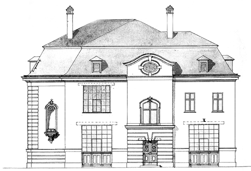 Die Nordseite der Düll-Villa mit den beiden Atelierräumen im Erdgeschoss, Plan aus dem Jahr 1892; Buchscan aus: Dorle Gribl, "Prominenz in Bogenhausen", München 2009.